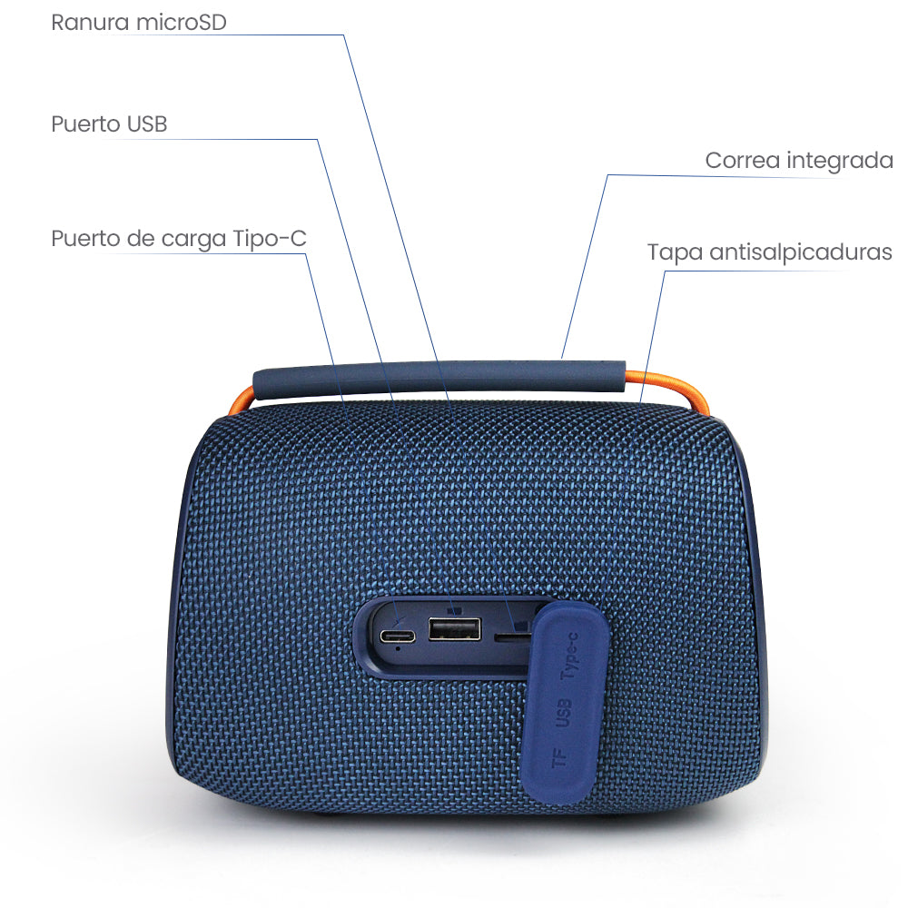 BOCINA TWS RECARGABLE CON LUZ Y CORREA INTEGRADAConexiones: Bluetooth/TWS/microSD/USB/RadioFMMarca: FOLBocina Bluetooth TWS con Luces RGB y Correa IntegradaTecnología TWS (True Wireless Stereo)La tecnología TWS permite conectar dos bocinas compatibles de forma inalámbrica para crear un sonido estéreo real, mejorando la experiencia auditiva al ofrecer un audio más envolvente y potente.Potencia y Batería Potencia de salida de 12W para un sonido fuerte y nítido. Batería recargable de 3.7V/2400mAh, que ofrece horas de entretenimiento continuo. Puerto de carga Tipo-C para una carga rápida y eficiente. Funciones de Reproducción Bocina de 78 mm (3.07 pulgadas) que ofrece graves profundos y agudos claros. Puerto USB y ranura microSD para reproducir música directamente desde una memoria. Sintonizador de Radio FM para escuchar estaciones de radio sin necesidad de otros dispositivos. Luces RGBCuenta con luces en los costados que cambian de color para ambientar cualquier espacio con un toque moderno.Diseño PortátilIncluye correa integrada para transportarla fácilmente. Disponible en tres colores: azul, gris y negro.Especificaciones Técnicas Potencia de salida: 12W Bocina principal: 78 mm (3.07 pulgadas) Batería: 3.7V/2400mAh Conexiones: Puerto de carga Tipo-C, USB, microSD Funciones adicionales: Radio FM, Luces RGB Colores disponibles: Azul, gris y negro